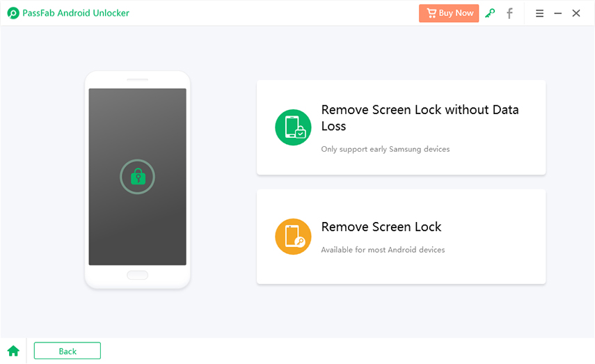 O próximo passo é selecionar como você deseja remover o bloqueio de tela, com perda de dados ou não. A opção de "remover bloqueio de tela sem perda de dados" é limitada aos primeiros dispositivos Samsung. Então, se você tem um dispositivo Huawei, você terá que escolher a opção para remover o bloqueio de tela com perda de dados.