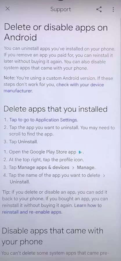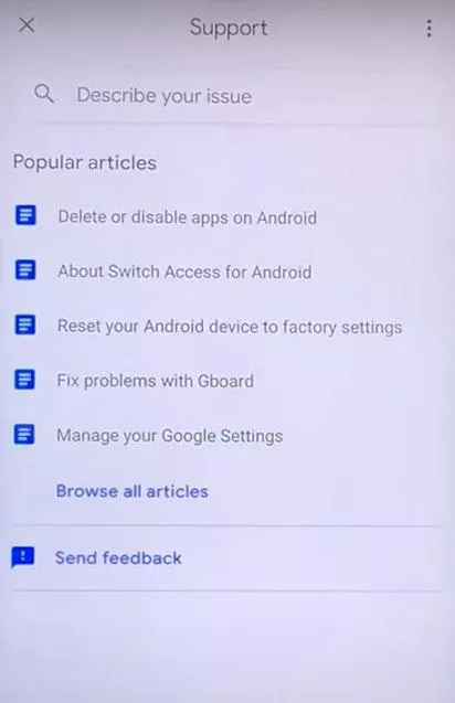 Novamente, visite a lista de conexões Wi-Fi disponíveis e selecione "Adicionar Wi-Fi" e, em seguida, visite as configurações do teclado. No menu de três pontos no canto superior direito, abra "Ajuda e Feedback" para visitar a página de suporte. Selecione ou procure pelo tópico "Excluir ou desativar aplicativos no Android" e, em seguida, clique na primeira opção "1. Toque para ir para Configurações do aplicativo."