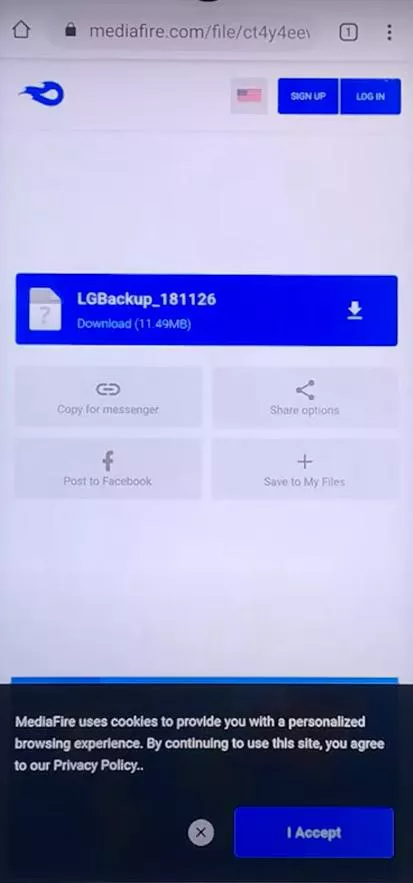 Na página da Web que se abre, primeiro clique em "Aceito" para permitir cookies e, em seguida, clique no ícone de download ao lado do nome do arquivo "LGBackup_181126".