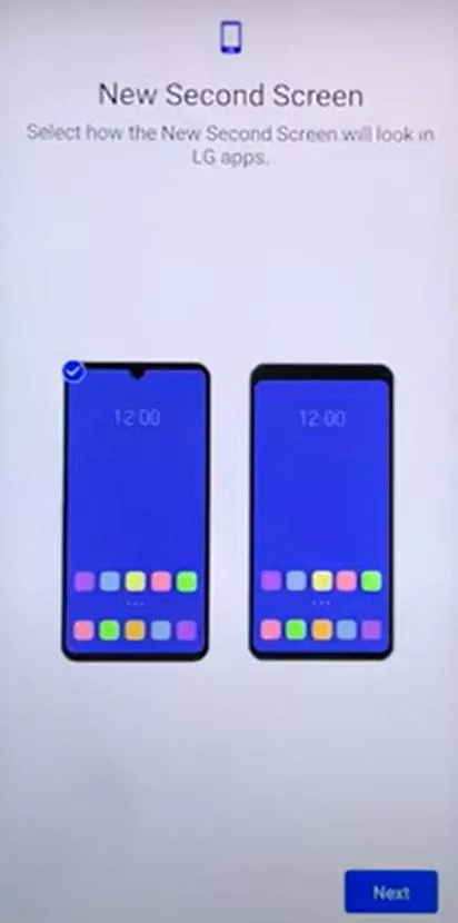 Na primeira tela depois de ligar o telefone LG, clique no botão de seta no círculo azul.