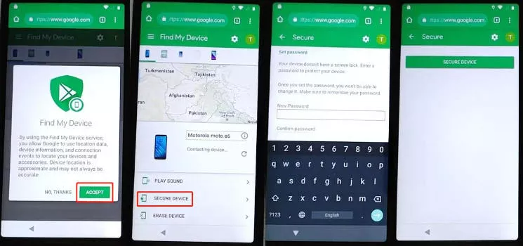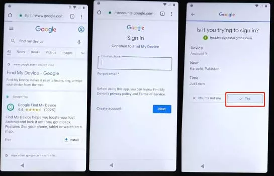 Vá para o navegador "Chrome" e pesquise "Encontre Meu Dispositivo". Nos resultados da pesquisa, toque em "Encontre Meu Dispositivo". Faça login com a mesma Conta do Gmail que você já adicionou ao seu dispositivo. Confirme a tela pop-up tocando em "Sim" e aceitando a tela pop-up do Encontre Meu Dispositivo.