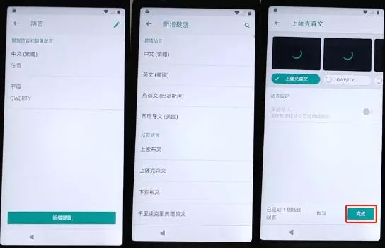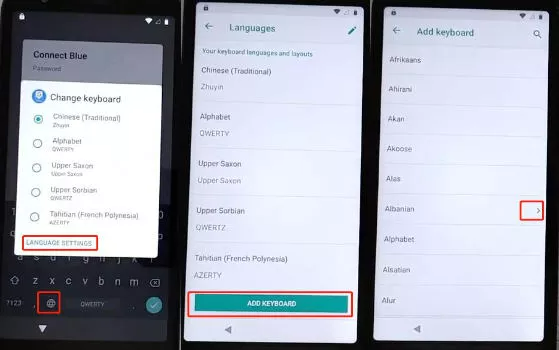 Adicione alguns teclados de idiomas indo em "Adicionar teclado" e selecionando qualquer idioma. Em seguida, selecione outro idioma e toque na "Opção Direita". Repita o processo mais uma vez: "Adicionar teclado > Selecionar idioma aleatório > Opção Direita". Esses três idiomas de teclado irão ajudá-lo a contornar a conta do Google no Moto E6.