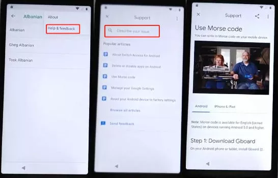 Toque nos três pontos e selecione "Ajuda e Comentários". Digite "Usar código Morse" na caixa de pesquisa. Abra o artigo "Usar código Morse" nos resultados da pesquisa. Reproduza o vídeo e toque no título do vídeo para acessar o youtube.com.