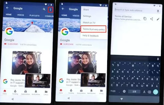 Arraste o vídeo do YouTube para baixo, toque nos "3 pontos" no canto superior direito e selecione "Termos e Política de Privacidade".