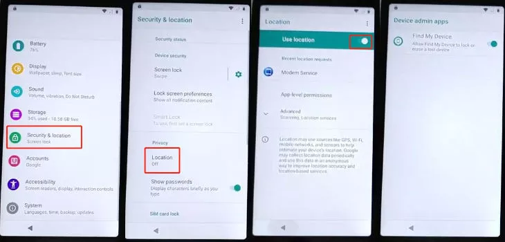 Vá para Configurações > Segurança e Localização > Localização > Ative sua localização. Em seguida, volte para Segurança e Localização > Aplicativo de Administrador do Dispositivo. Verifique se "Encontre Meu Dispositivo" está ativado.