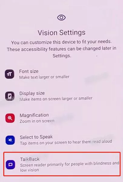 Você encontrará duas opções na parte inferior da tela. Selecione "Configurações de Visão" aqui e, em seguida, ative o Talkback.