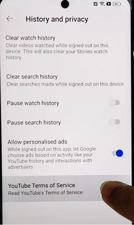 - Nas configurações, clique em Histórico e Privacidade. Lá você encontrará a opção Termos de Serviço do YouTube. Clique no botão conforme indicado na imagem abaixo.