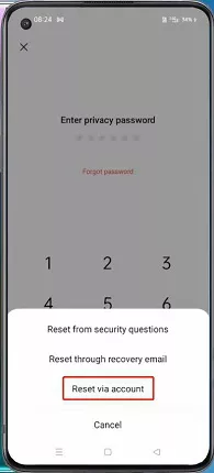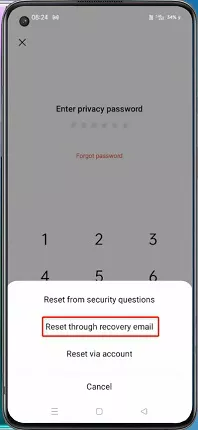 A maneira mais fácil e rápida de redefinir a senha de privacidade da OPPO quando você a esqueceu é através do e-mail de recuperação. Você tem a opção de adicionar um e-mail de segurança ao definir a senha de privacidade. Siga estas etapas para redefinir a senha de privacidade do OPPO por meio do e-mail de recuperação: