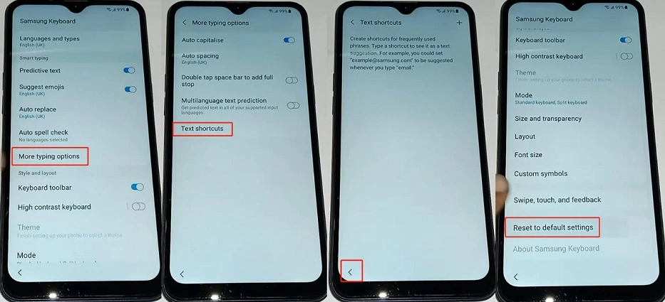 Vá para as configurações do teclado na tela, toque em "Mais opções de digitação" > "Atalhos de texto" e toque duas vezes em "<" no canto inferior esquerdo da tela do dispositivo para voltar à tela anterior. Role para baixo e toque em "Redefinir para configurações padrão". Toque novamente em "<" para voltar à tela de boas-vindas.