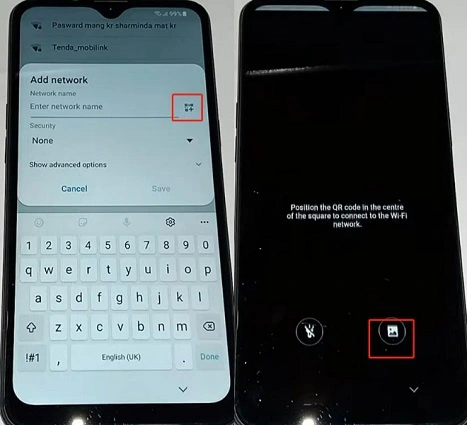 Enquanto estiver carregando, toque em "<" para chegar à tela "Conectar ao Wi-Fi". Toque em "Adicionar nova rede" e tente adicioná-la usando um código QR usando a câmera primeiro e depois o álbum do telefone.