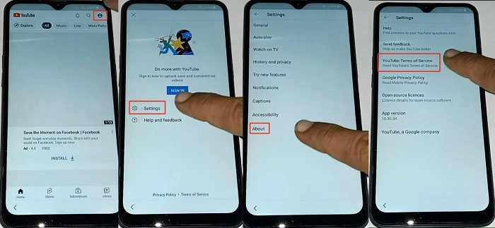 Vá para as configurações do YouTube > "Sobre" > "Termos de serviço do YouTube". Isso o levará à tela de boas-vindas do navegador Google Chrome. Toque em "Aceitar e continuar" > "Não, obrigado".