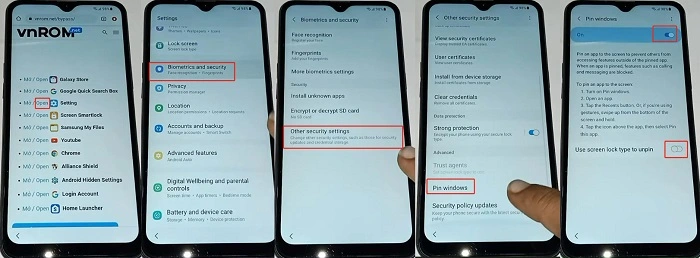 Nesta página, selecione a terceira opção "Configurações" > "Biometria e segurança" > "Outras configurações de segurança" > "Fixar tela". Ative a opção e toque em "Usar tipo de bloqueio de tela para desafixar". Selecione "Padrão" e desenhe um padrão duas vezes para confirmar. Agora, toque várias vezes na tecla de retorno "para voltar à tela de boas-vindas do dispositivo.