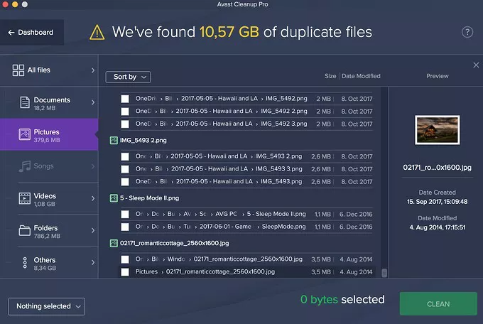 A opção Encontrar Arquivos Duplicados no Avast Cleanup Pro Mac pode rastrear arquivos duplicados, fotografias, músicas, gravações e alguns tipos diferentes de documentos de arquivos duplicados.