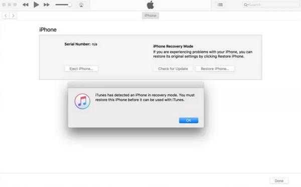 - Passo 3. O iTunes exibirá uma notificação informando que detectou um iPhone em modo de recuperação. Clique em "OK".