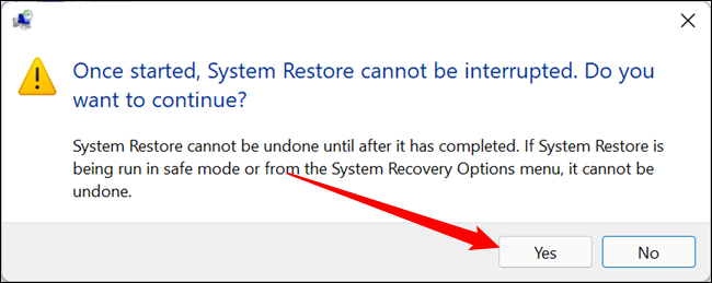 - A restauração do sistema informa que, uma vez iniciado, o processo de restauração não pode ser interrompido. Clique em Sim para começar.