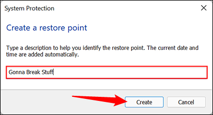 Digite uma descrição para o ponto de restauração que o ajudará a lembrar por que você o criou e clique em Criar.