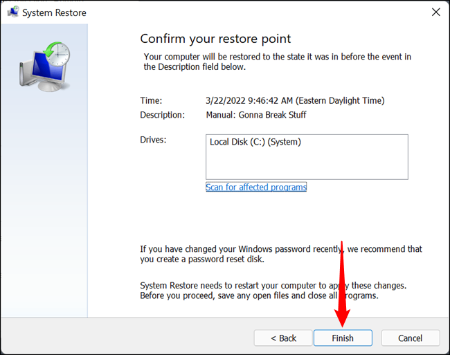 - Em seguida, você será solicitado a confirmar a recuperação. Verifique se você selecionou o ponto de restauração correto e clique em Concluir.