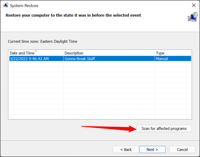 - Quando estiver pronto para restaurar, clique no ponto de restauração que deseja usar e clique em Avançar. Observe que você pode ignorar a etapa de verificação e clicar em Próximo diretamente, mas é melhor ver quais aplicativos são afetados antes de iniciar o processo.