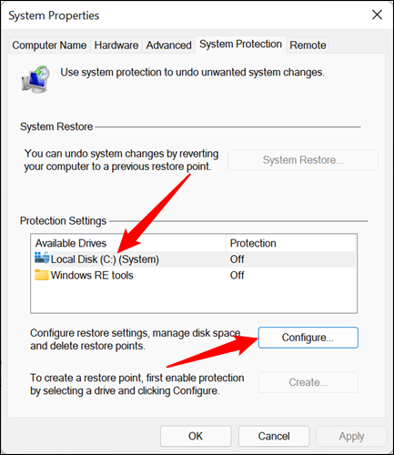Na seção Configurações de Proteção da guia Proteção do Sistema, você verá as unidades disponíveis no PC e se a proteção está habilitada para cada unidade. Para abrir a proteção, selecione uma unidade na lista e clique no botão Configurar.