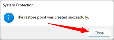 Pode levar cerca de 30 segundos para criar um ponto de restauração e a restauração do sistema informa quando for concluída. Clique em Fechar.