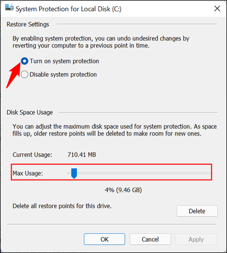 Na caixa de diálogo Proteção do Sistema que é aberta, clique na opção Abrir Proteção do Sistema, ajuste o controle deslizante Uso Máximo para a quantidade de espaço no disco rígido que você deseja que o sistema possa restaurar e clique em "OK".