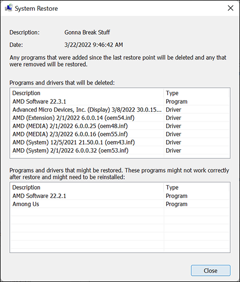 - A Restauração do Sistema fornecerá duas listas. A lista superior mostra os programas e drivers que serão removidos quando você restaurar o Windows para o ponto de restauração selecionado. A lista inferior mostra programas e drivers que podem ser recuperados pelo processo. Da mesma forma, mesmo programas e drivers restaurados podem não funcionar corretamente até que você tenha reinstalado completamente.